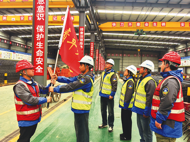 2月27日,随着春节假期结束,项目建设迎来复工复产关键期。中铁八局政和大道项目部组织开展“青年安全质量监督岗”复工复产动员活动,引导青年员工以饱满热情投身安全生产一线,助力项目建设平稳开局。图为授旗仪式。 危唯 摄