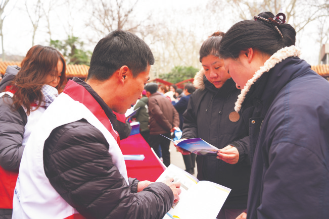 3月5日,中铁上海局四公司组织青年志愿者参加天津市滨海新区志愿服务活动。图为志愿者向行人宣介企业青年志愿服务队事迹。 胡育松 摄