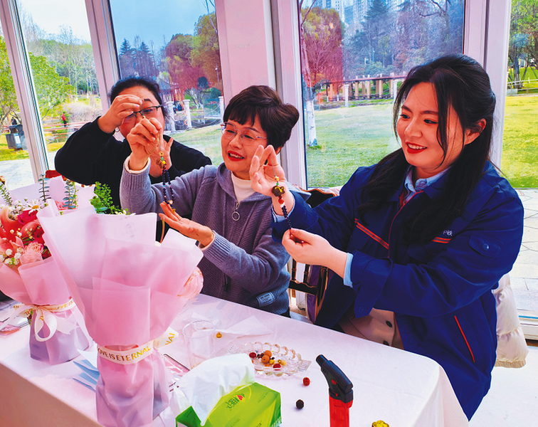 近日,中铁大桥局机械化施工分公司工会组织开展“我爱大桥局,巾帼绽风华”“三八”妇女节活动,活动邀请传统非遗知音汉香代表性传承人曹艺馨亲临现场,详细讲解了串珠文化底蕴与制作技巧,带领女员工沉浸式体验手工魅力。 陶佳悦 摄