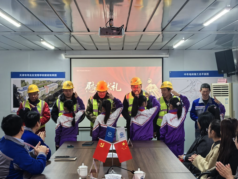 近日,中铁六局天津公司房水电项目部联合天津市河北区育婴里小学开展“情暖建设者”企地共建活动。图为学生们慰问奋战在施工一线的城市建设者。 商彤 摄