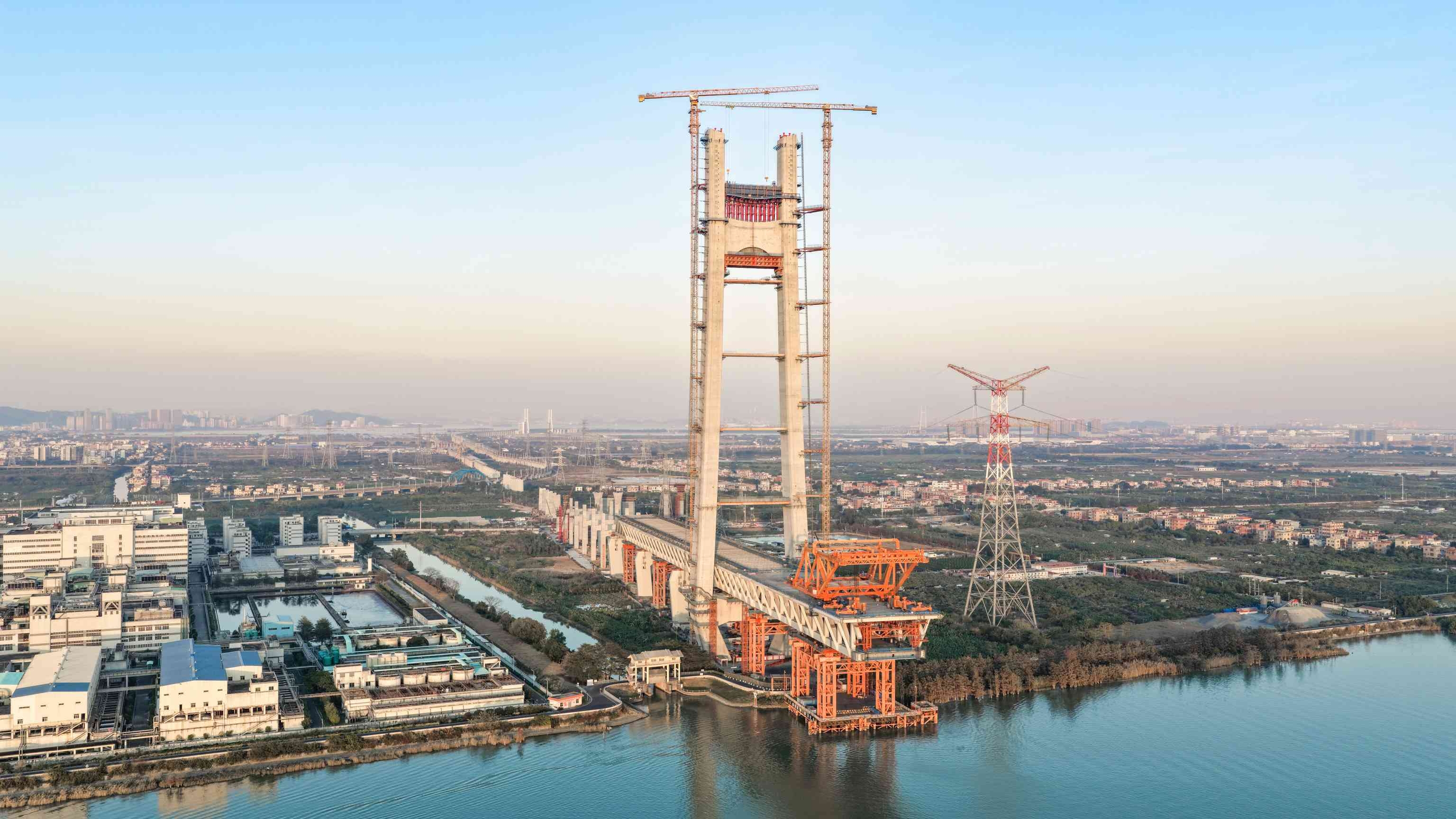 1月11日,中国中铁旗下中铁大桥局承建的深江铁路洪奇沥水道公铁大桥50号墩主塔封顶,至此该桥两座主塔全部封顶。