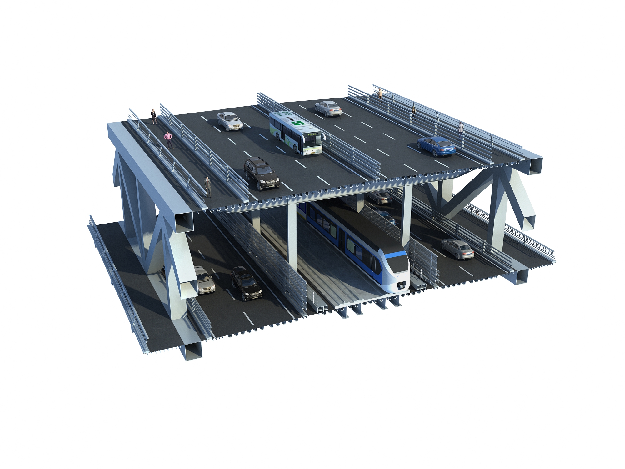 中铁大桥院设计团队聚焦飞云江通航保护、施工精度控制等核心需求展开攻关,实现多项技术突破。针对多种交通功能共通道过江的需求,创新采用双层钢桁梁新结构,通过多框格板桁组合设计与竖向连杆协同受力机制,显著提升结构刚度、降低建筑高度,减少桥面总高程及两岸接线长度,实现空间高效利用。面对最大悬臂130米等严峻工况,首创“双节间步长滑道异步顶推施工方法”,在不影响江面通航等前提下,实现超大跨度顶推作业。