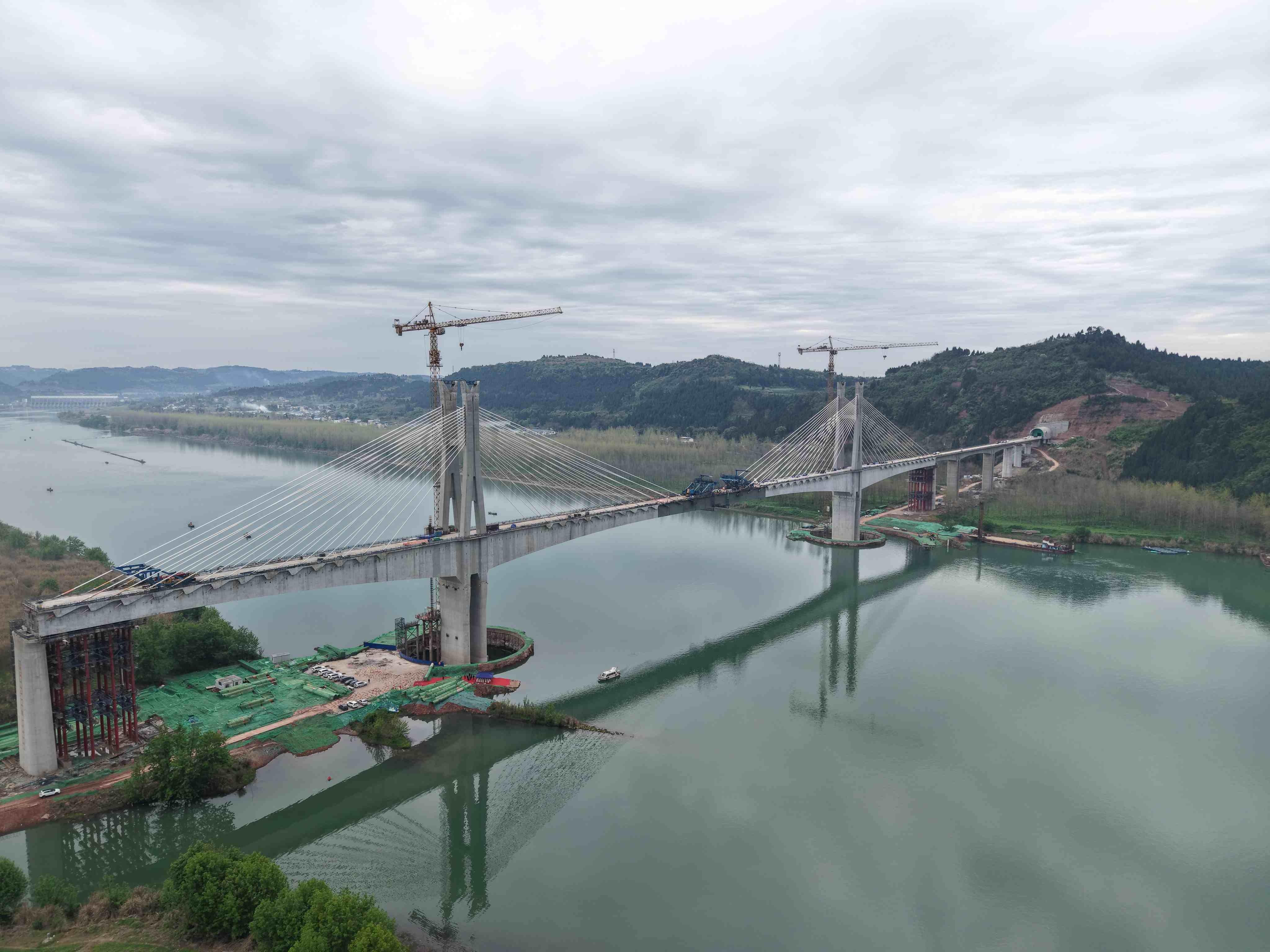 成达万高铁是我国“八纵八横”高铁网沿江通道的重要组成部分,正线全长477公里,设计时速350公里。嘉陵江特大桥位于南充市顺庆区与高坪区交界处,是全线“四桥三隧”重难点控制性工程之一,全长6830米,主桥为“H”形特殊结构双塔双索面钢混结合梁斜拉桥。