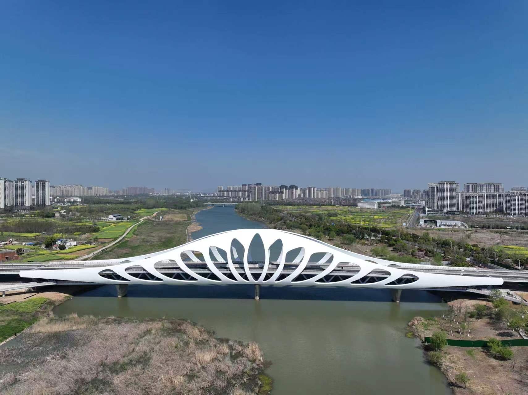 九梓大桥位于安徽省滁州市中新苏滁产业园,南北向跨越清流河,全长1500米,由路基段、钢结构主桥和现浇梁桥等部分组成。其中,主桥长260米,共设4跨,分上下两层,分别为机动车道与非机动车道。拱壳设计以“荷花”为造型,取“盛世荷韵”之意。建成后将成为当地标志性桥梁,对加强产城融合及缓解清流河现有桥梁通行压力具有重要意义。