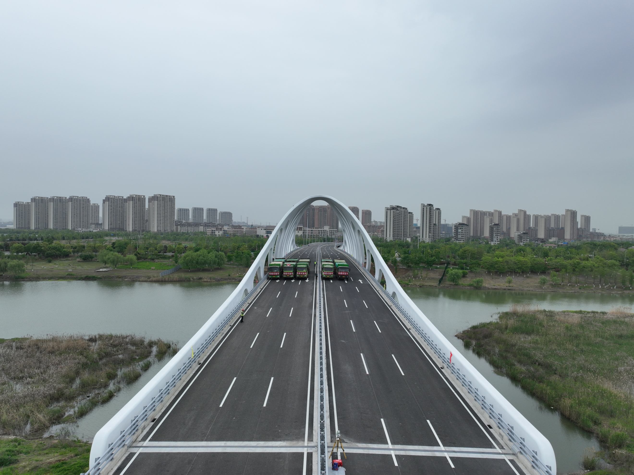 此次荷载试验由建设方委托独立第三方进行,业主方、监理单位等代表全程跟检。静载试验时,采用12辆载重为35吨的加载车。动载试验主要包括无障碍行车试验、有障碍行车试验和制动试验等。经过一天的现场测试,项目各项参数指标均符合相关规范要求。